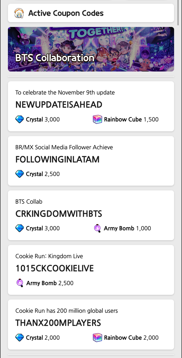 [English] How to Insert Coupon - BTS WORLD - Netmarble Hello, this is BTS WORLD MANAGER. We would like to provide this guide on how to use the BTS W... Hello, this is BTS WORLD MANAGER. We would like to provide this guide on how to use the BTS W... Recent Search History Delete All History. Log In -BTS WORLD. Official Forum. 4,361,912. All Posts; GUIDES. GAME GUIDES; FAQ; Q&A ... 30% OFF BTS Store Coupon Code | Discount Code 2022 - ScoopCoupons BTS Store Coupon Code - Save Up To 40% Off On Your Shopping. Deal No Expires Hurry Up! Grab 40% Off On All Deals With BTS ... More Get Deal 100% Success 4 Used - 0 Today Share Email 0 Comments Filter Store Categories Clothing And Accessories Sort by Newest Popularity Ending Soon Expired Popular Stores I just bought the OST album and got the coupon that comes with ... - reddit I just bought the OST album and got the coupon that comes with it. I'm on an iOS device and can't figure out how to enter the coupon code anywhere online since the link on the coupon isn't valid anymore. 3 NEW COUPON CODES IN BTS X CRK COLLAB COMING?! 😱💜 I Cookie Run ... Just like the previous live Broadcast of Devnow and Disney Event Collab, we are given 1-2 Coupon Codes to redeem and get some rewards. Maybe we will have another 2 coupon codes for this BTS...